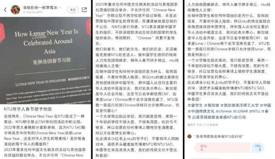 One Little Red Book user, who apparently supported the vandal, was upset that the words "Chinese New Year" are not allowed by NTU.