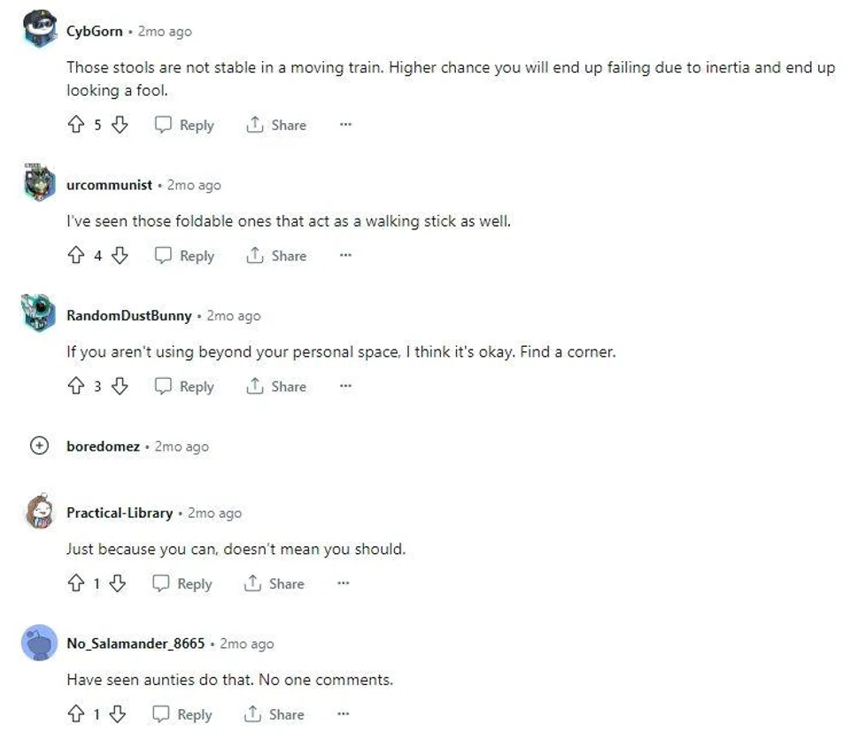 Two months ago, a Reddit user posed the question of whether commuters can bring their own stools or chairs on public buses and trains.