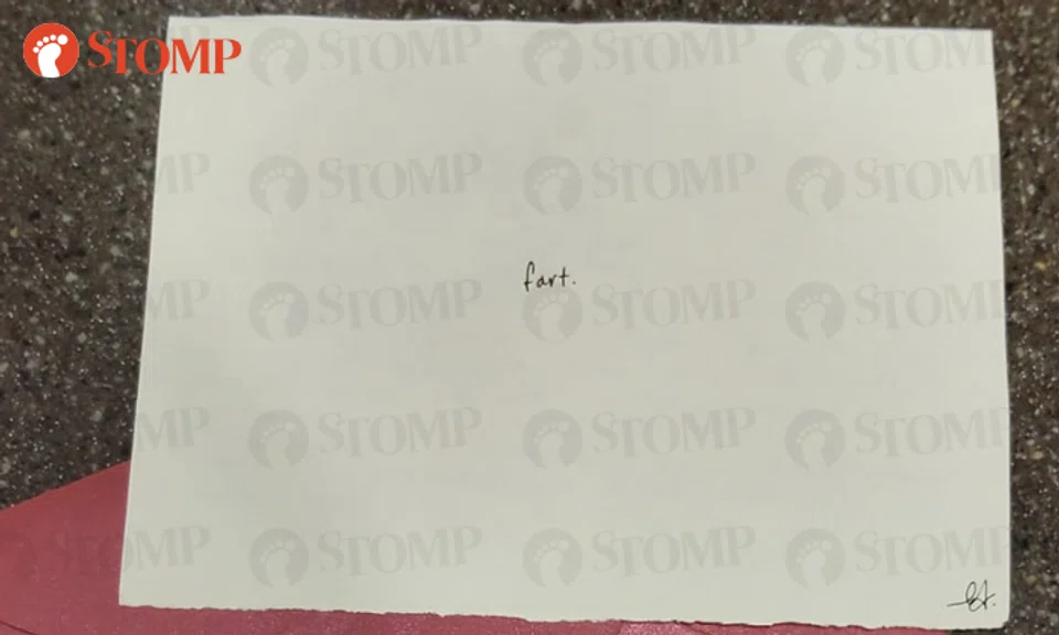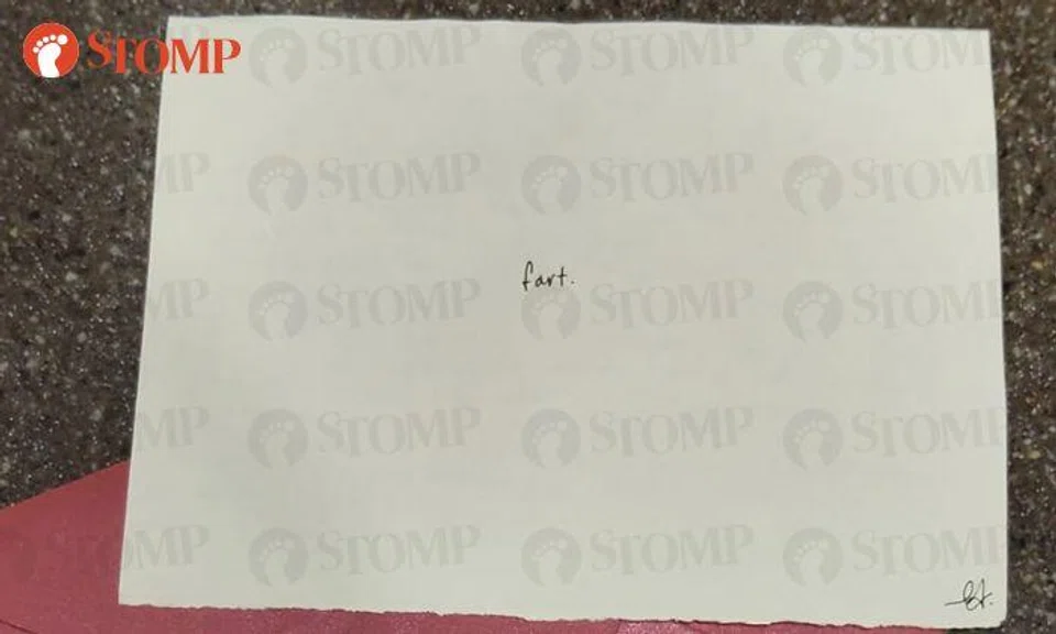 Stomper Anonymous picked up the note, which was in a pink envelope, on the MRT station's concourse level at around 10.50am.
