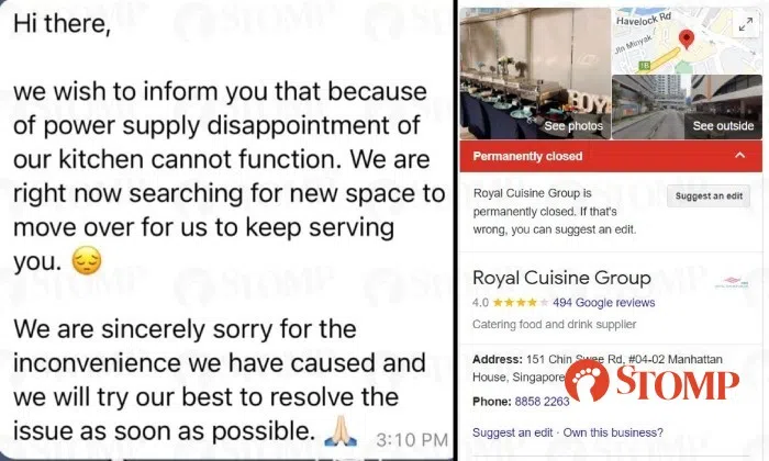 As for the customers who did not get the meals they ordered, Mr Yong said: "As the Royal Cuisine Group and its brands have ceased operations, consumers are advised to file a claim with the Small Claims Tribunals to recover their monies.