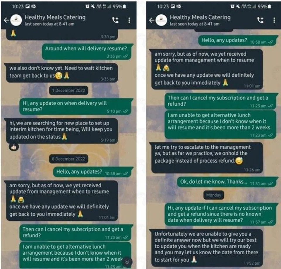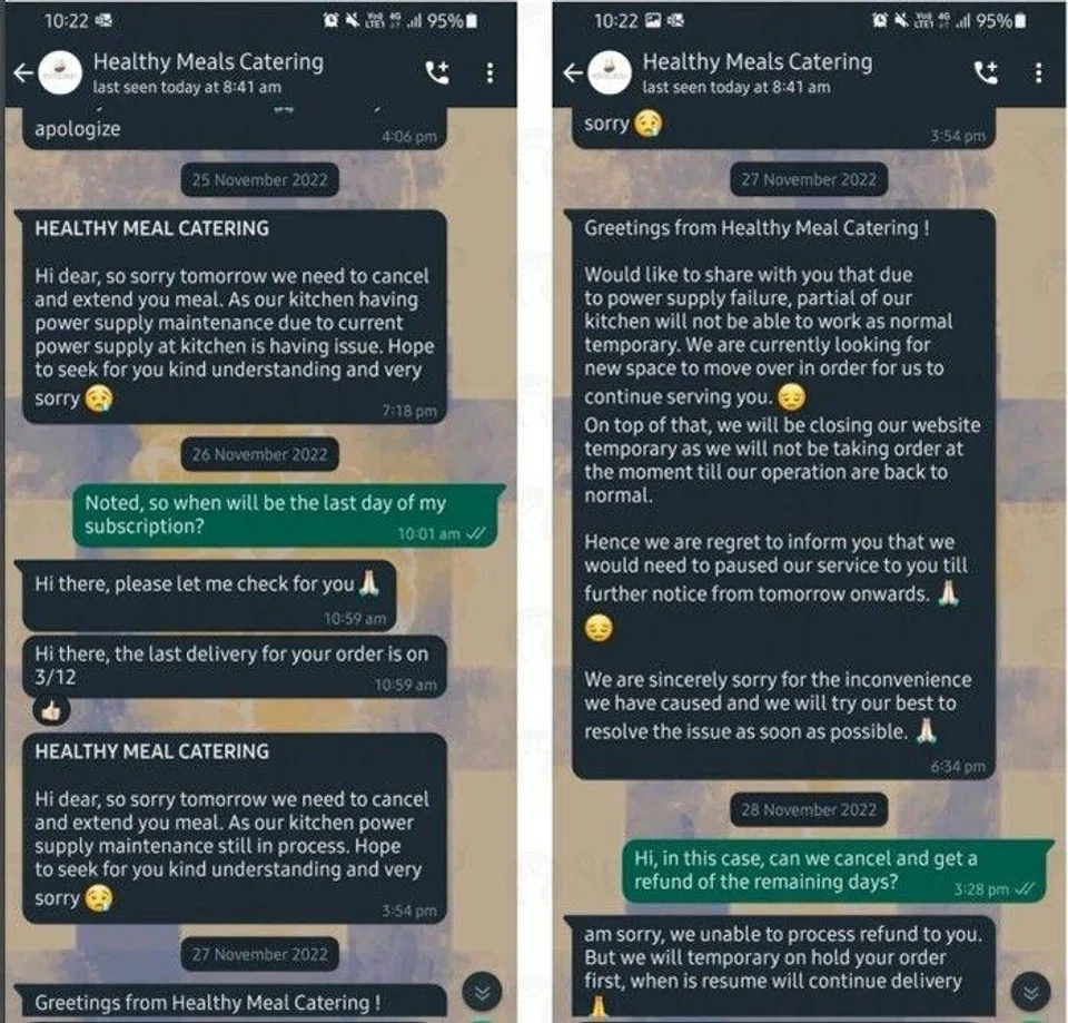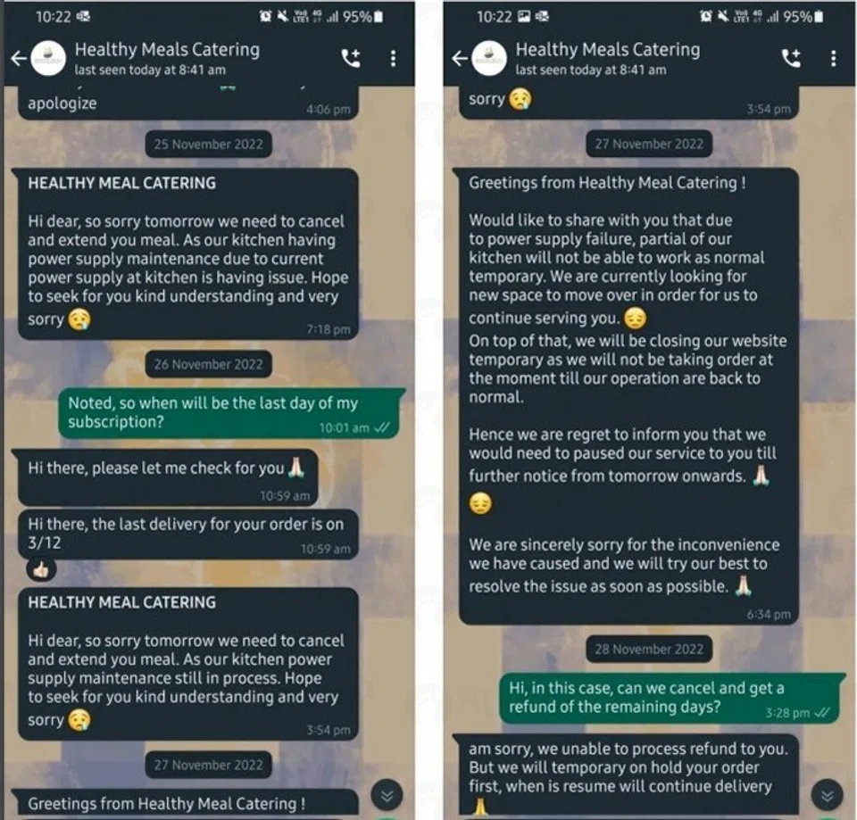 "However, on Nov 25, the caterer informed me that there is some issue with their kitchen and they are unable to provide the service," said Ng, adding that the company refused to refund her for the remainder of the package.