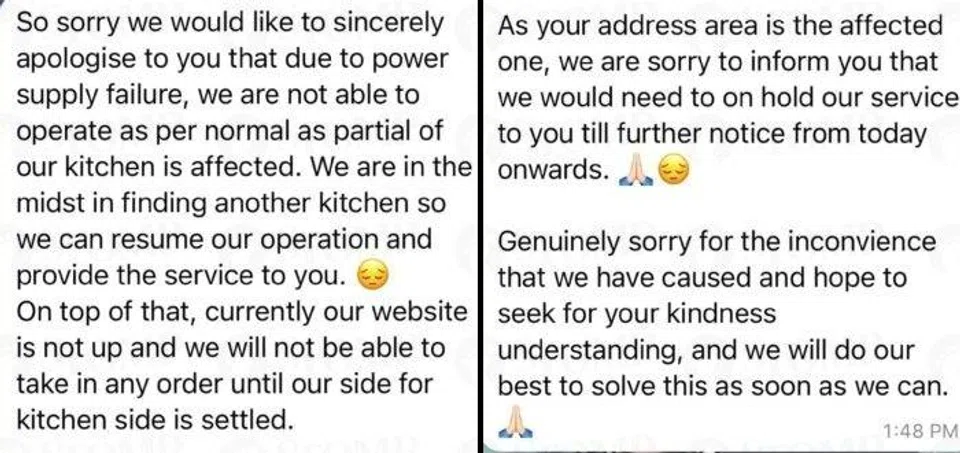 Yeo received a message from the company that said: "Due to power supply failure, we are not able to operate as per normal as part of our kitchen is affected."