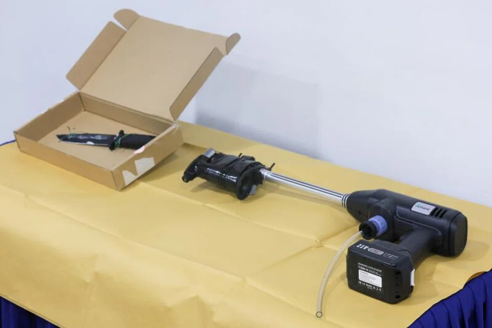 He fell to the ground and was immediately arrested. A knife was found near him. The improvised flamethrower and the knife were seized as case exhibits.