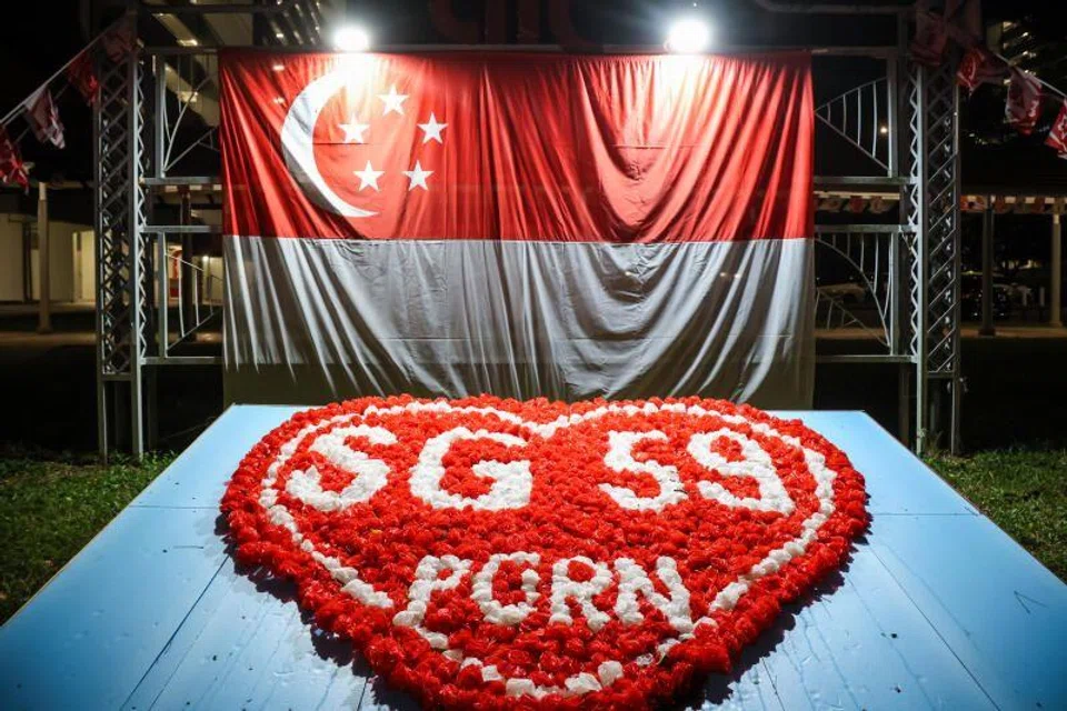 The heart-shaped decoration by the Pandan Gardens Residents’ Network (PGRN) was supposed to say "SG 59 PGRN". But one of the flowers had been moved to change the G to an O. So it said "SG 59 PORN" instead.
