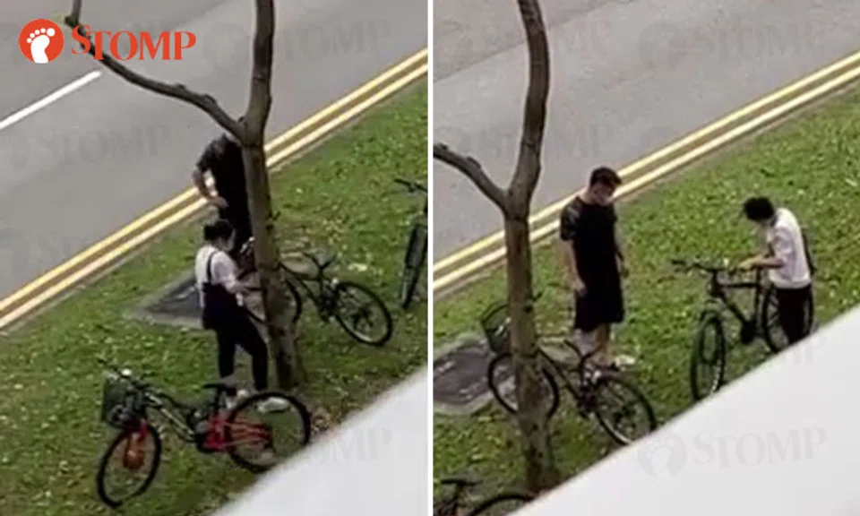 Couple acts suspiciously while 'browsing' bicycles parked next to walkway in Woodlands