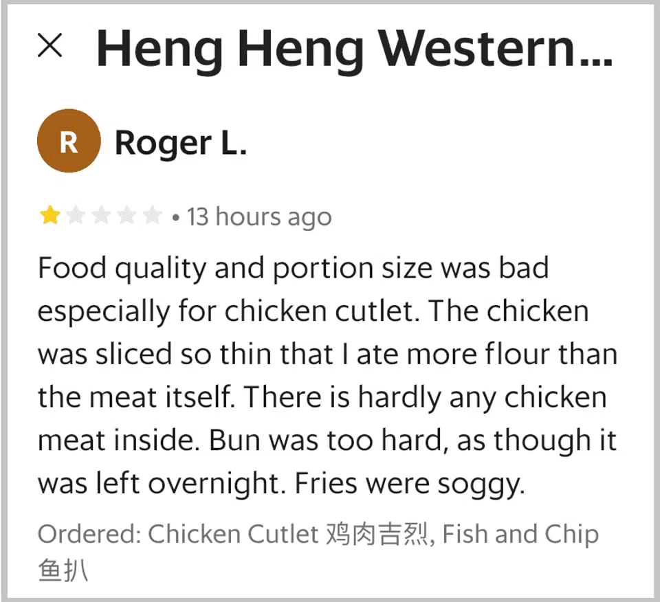 Her husband Roger also gave the western food stall a one-star review on the GrabFood app.