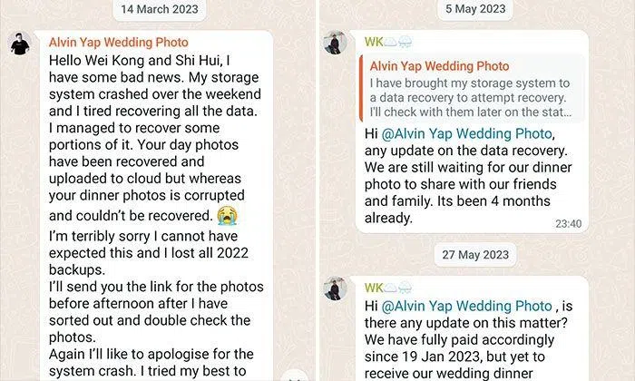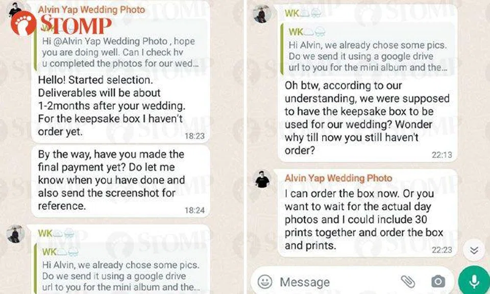 In screenshots of their conversation with the photographer, he said their photos would be ready in March, almost three months after the wedding.