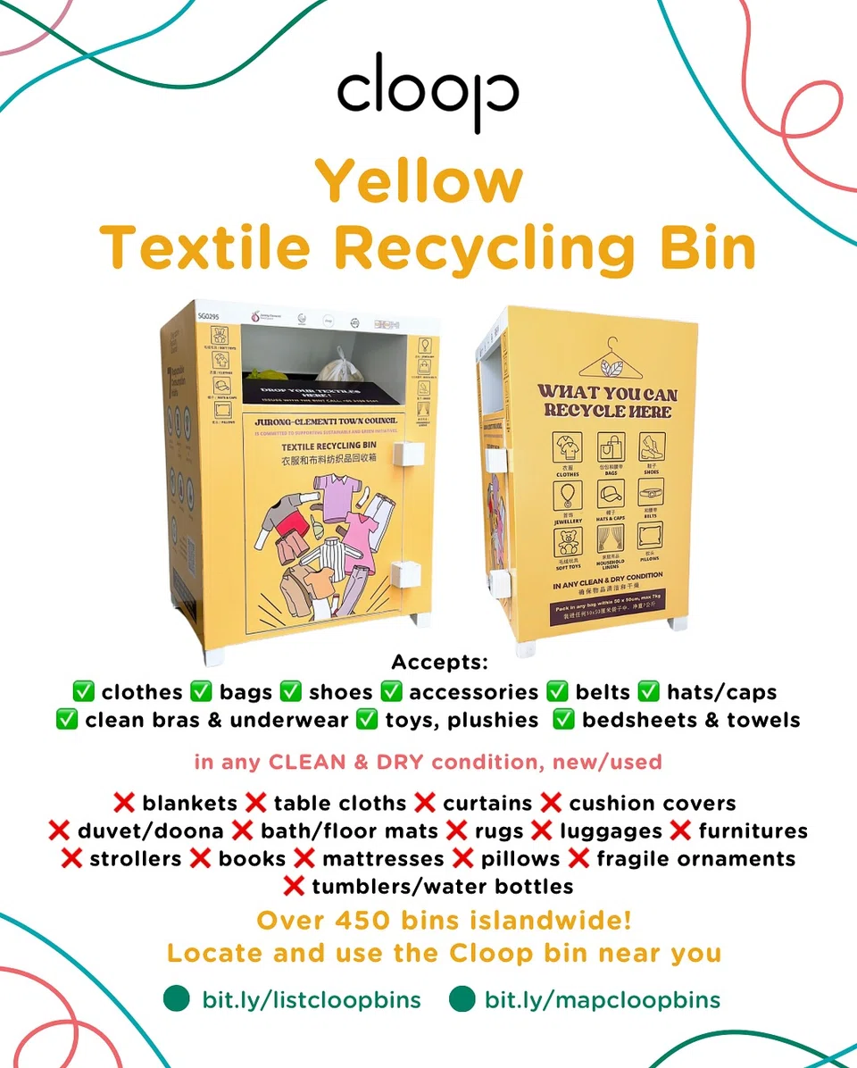 The bins belong to Cloop, which describes itself as a "circular fashion social enterprise focused on reducing fashion overconsumption and waste by helping consumers close the textile loop with solutions for pre-loved apparel/textiles and sustainable shopping alternatives".