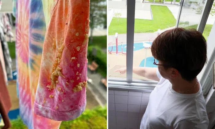 Photos provided by Ms Xiao showed laundry rods and clothes on the drying rack covered in food. She also reported seeing pigeons flocking on the ground floor, pecking at food remnants.