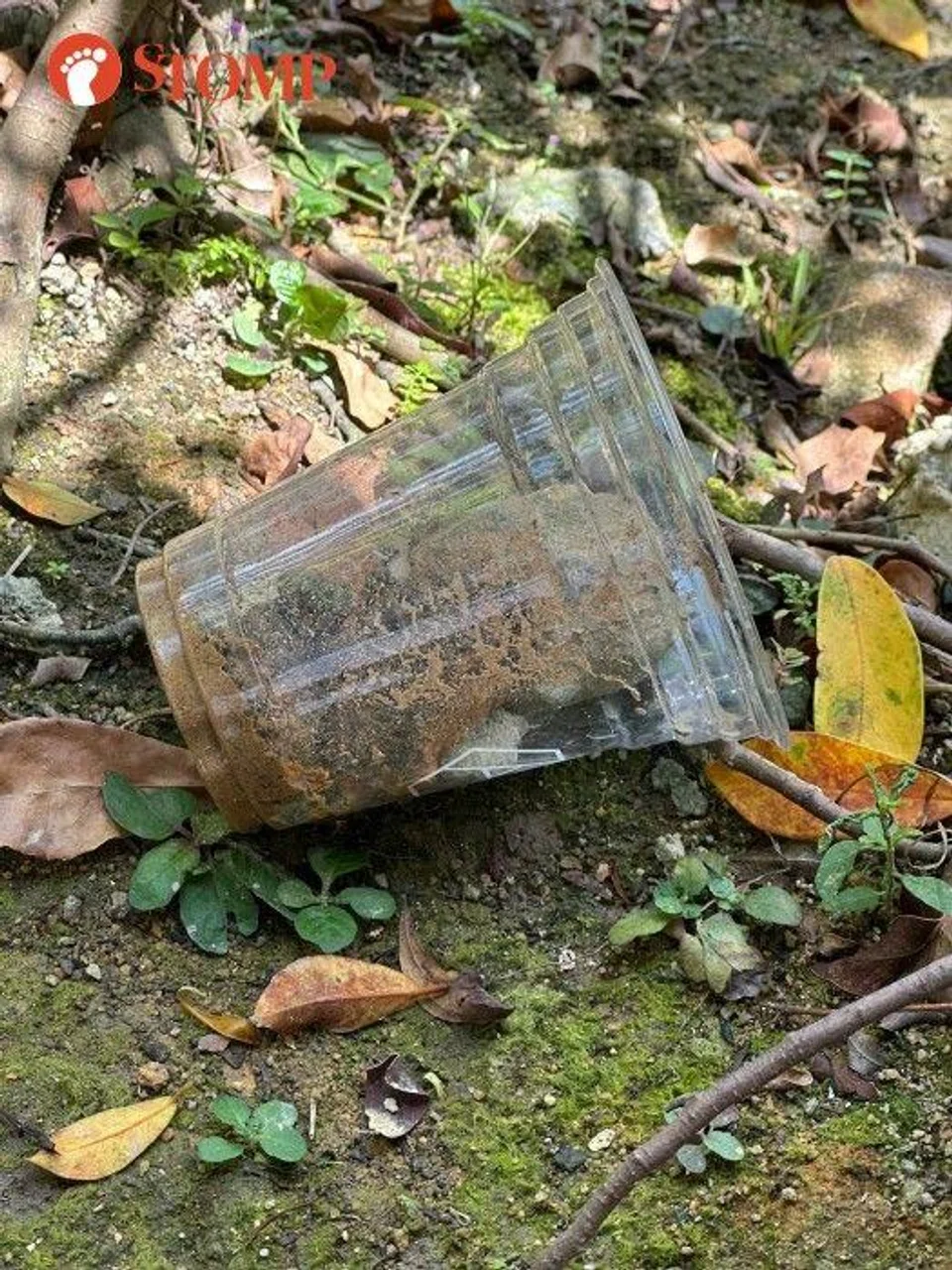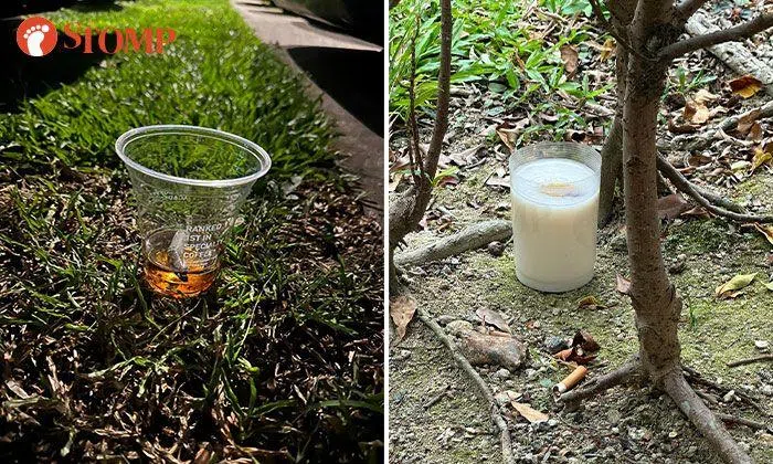 Cups of water left for community cats at Haig Road filled with sand, cigarettes and disinfectant