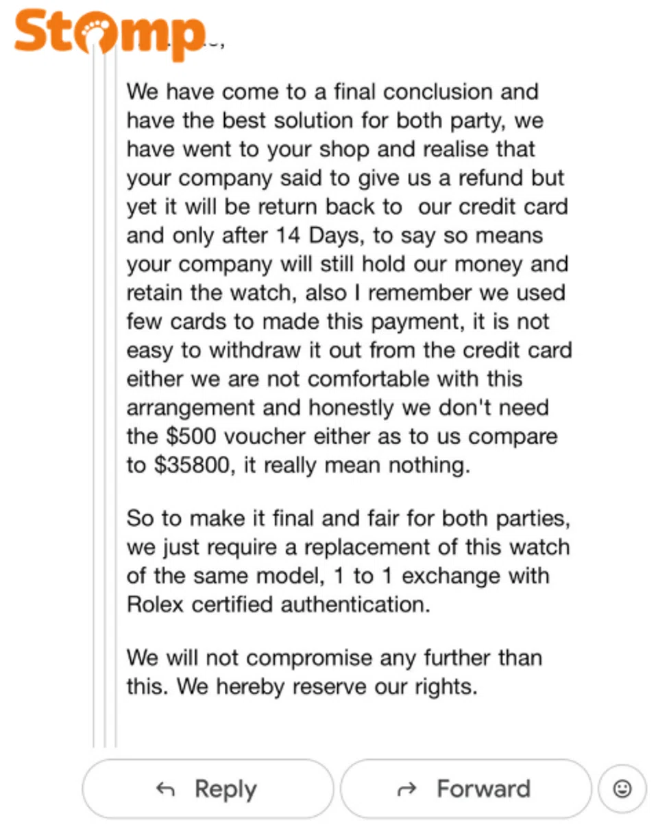 Dee said he found the offer of a full refund with the $500 voucher “insulting”, as his money would have easily “gone to (the) drain” if he had not taken the watch for servicing.