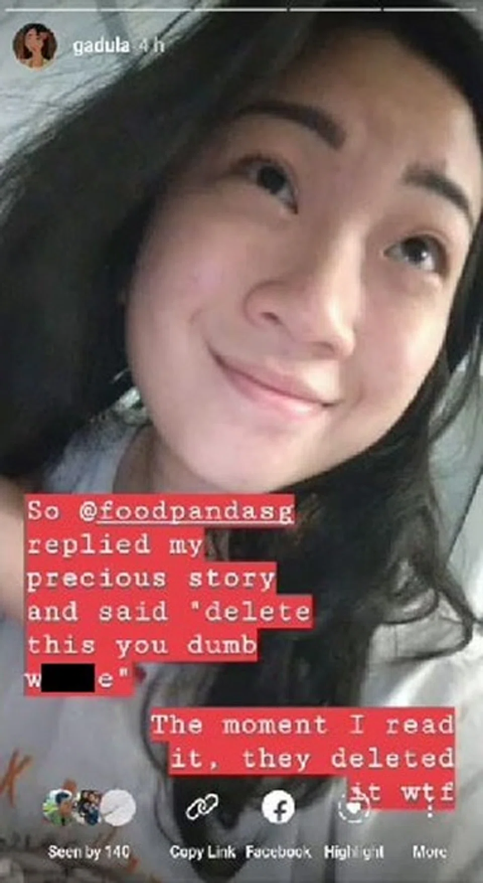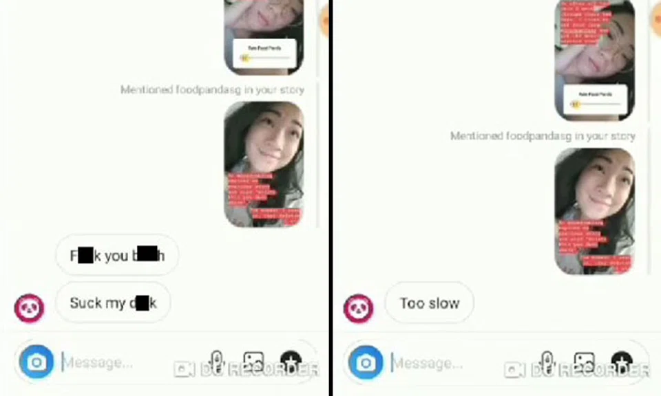 She said the account promptly deleted the message which spurred her to "bait" the account by posting another story tagging Foodpanda and this time, she had her phone's screen recording function ready.