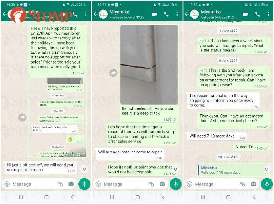 When Linda didn't hear from Miyamiko after the holidays. she messaged the company several times and after another public holiday (Vesak Day on May 15), she finally received a reply on May 20: "Hi, just a bit peeled off, we will send you some paint to repair."