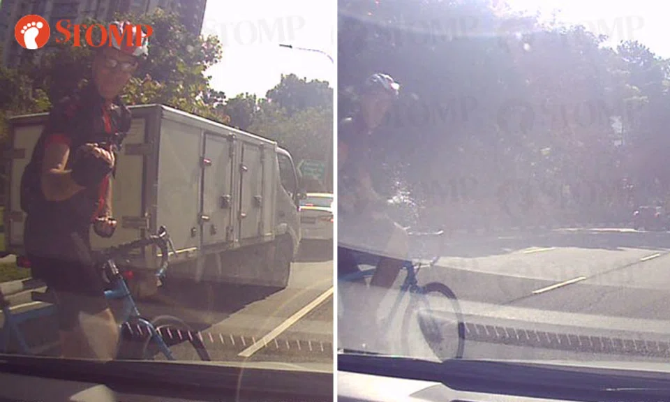 A cyclist was caught on video splashing water onto a car and making rude hand gestures at its driver after he was honked at along Napier Road on Apr 14.