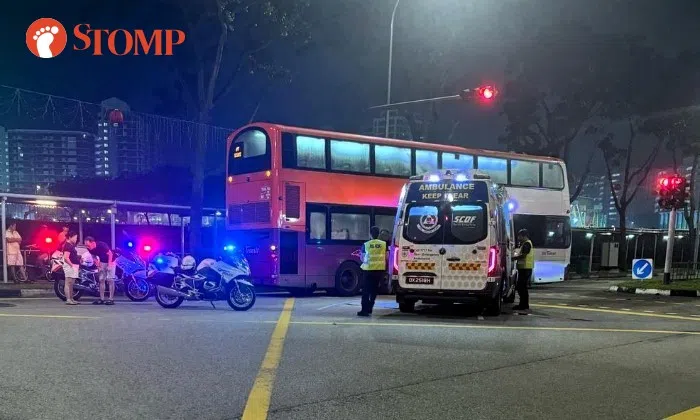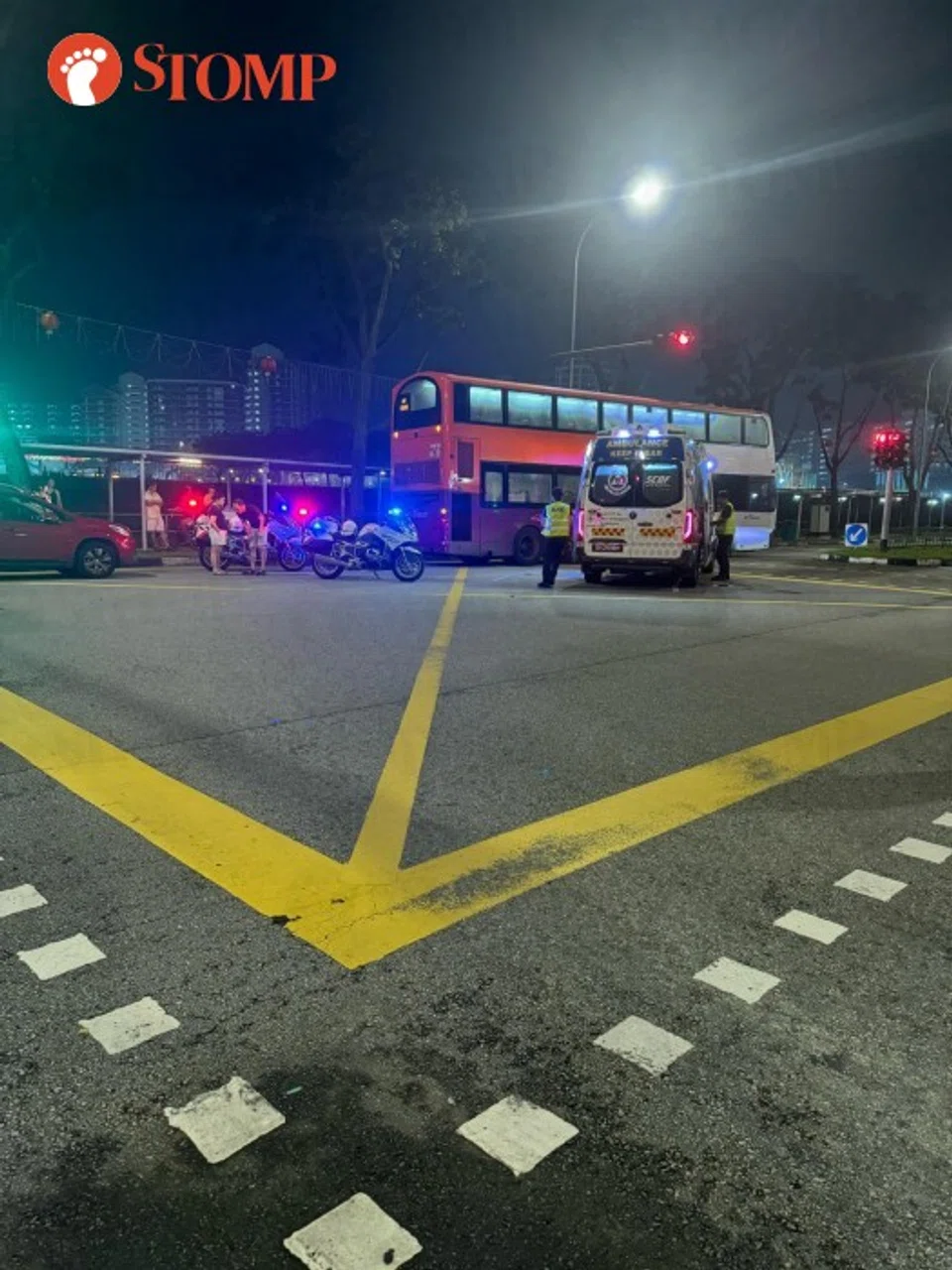 A Stomper shared a photo of the accident's aftermath, showing a SBS Transit double-decker bus, an ambulance and two Traffic Police motorcycles at a T-junction.