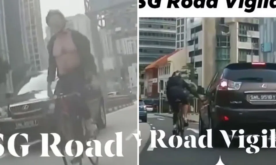 A cyclist was caught on video weaving in and out of traffic while also gesturing at motorists along River Valley Road towards Clemenceau Avenue on Apr 27.