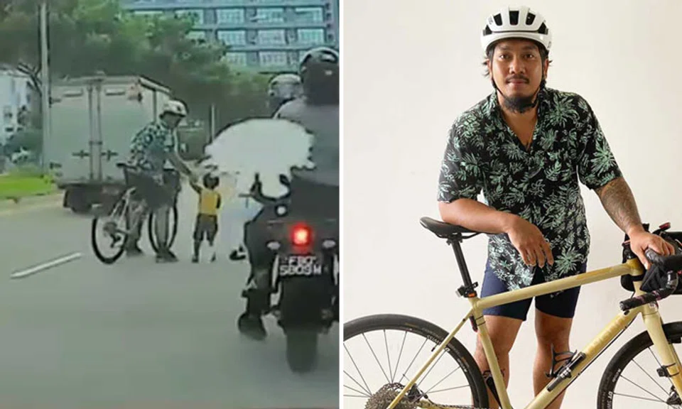 A cyclist who stopped his bike in the middle of a busy road to save a young child has shared his side of the story. And there's something he needs to clarify.