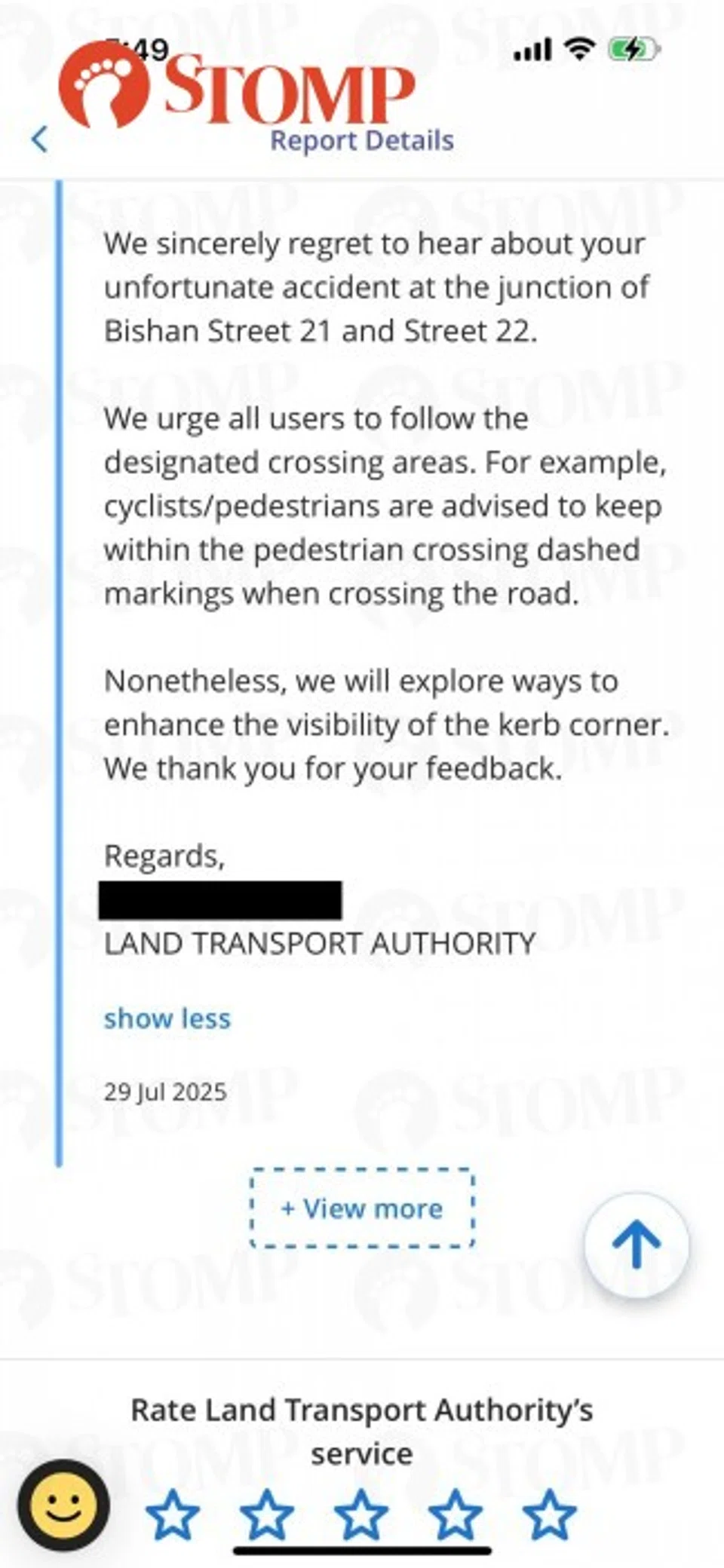 He shared: "I was given another four weeks of MC. I hope this Stomp article will help other cyclists avoid the hazard and also prompt the authorities to do something."