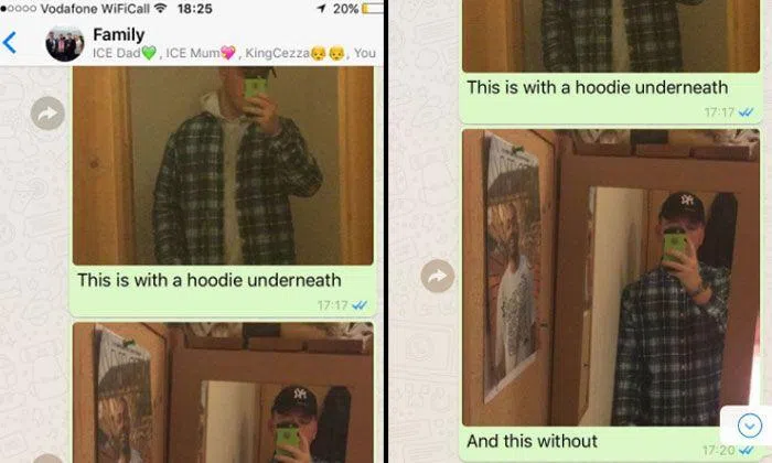 At his mother's request, this son sent two pictures of himself with a new top, one "with a hoodie underneath" and one without.