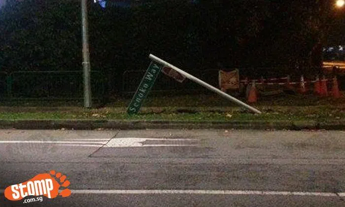 Stomper Rabby spotted a damaged road sign that was titled at an odd angle along Senoko Way.