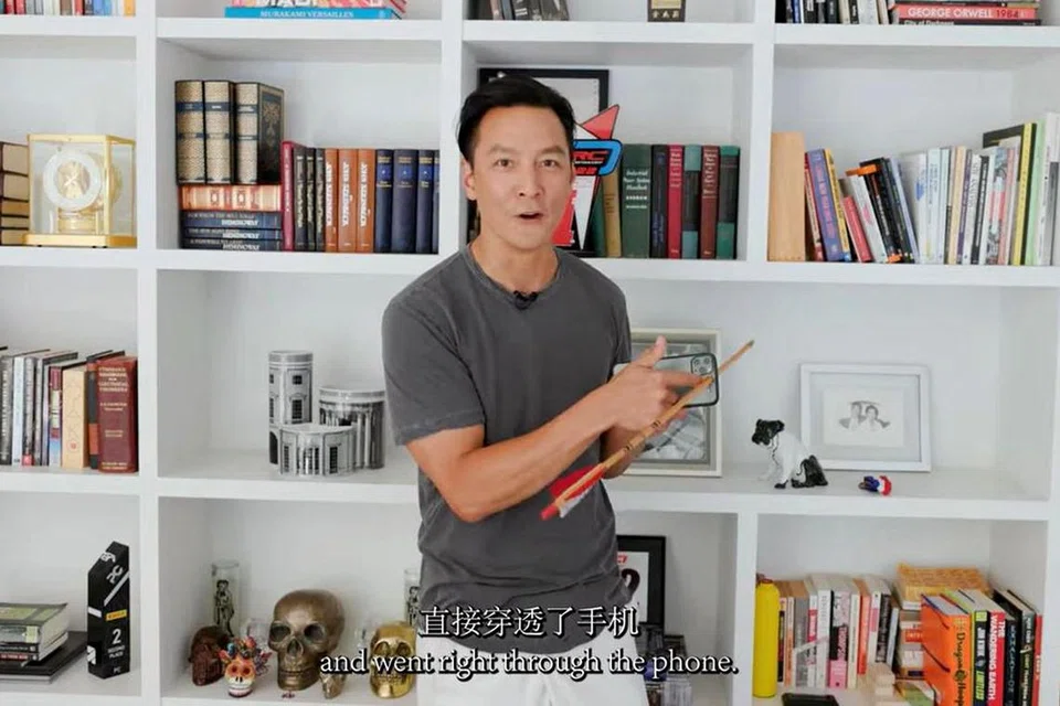 Actor Daniel Wu, who was trained as an architect, showing off one of the "artworks" displayed in his Los Angeles home - a phone with an arrow in it. PHOTO: AD CHINA/YOUTUBE