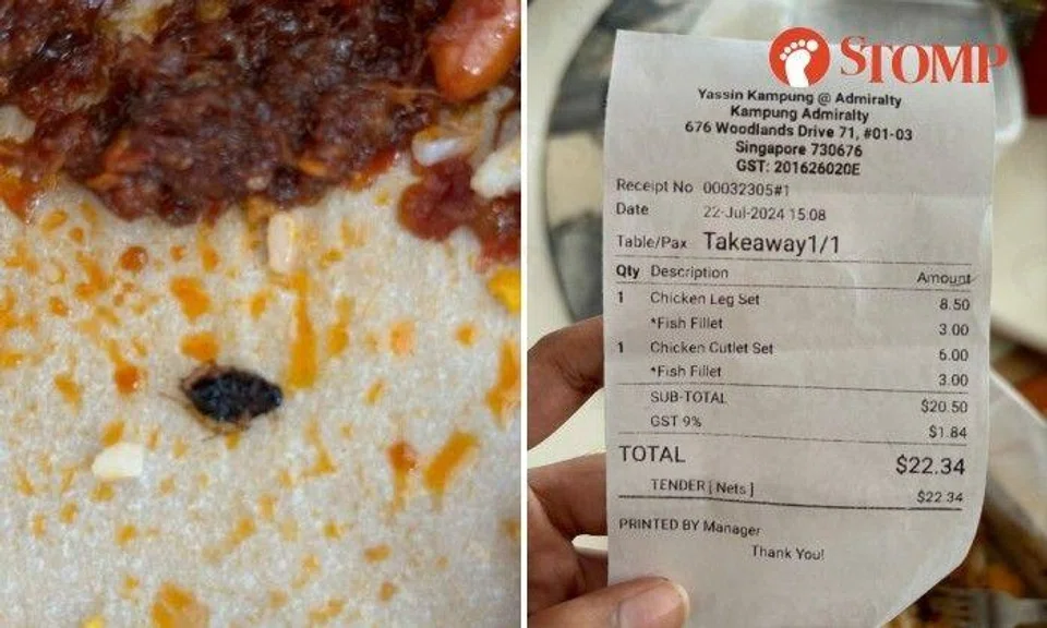 "I bought the nasi lemak from Yassin Kampung in Kampung Admiralty and while eating it halfway, I found a cockroach in the sambal," said the Stomper, who also shared a photo of the receipt.