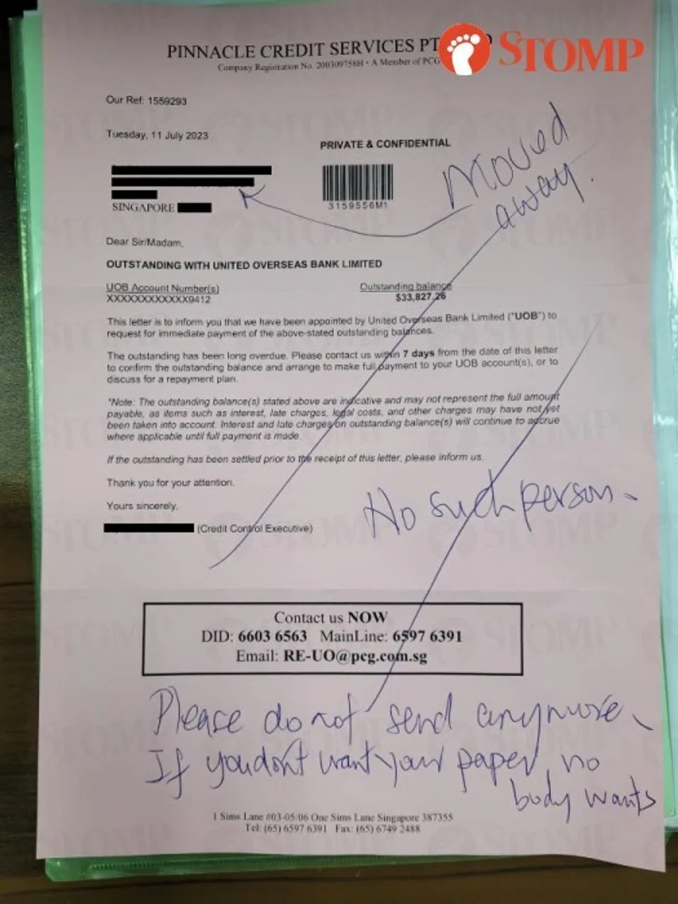 Stomper Ng shared a copy of a letter from Pinnacle Credit Service, which said that the company had been appointed by United Overseas Bank (UOB) to request payment for an outstanding balance of $33,872.26.