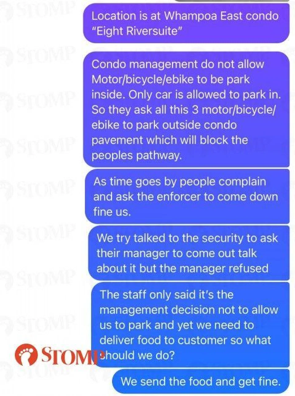The Stomper also shared a screenshot of messages about the incident, which said: "Condo management does not allow motor/bicycle/e-bike to be parked inside. Only cars are allowed to park inside. So they asked all these motor/bicycle/e-bike to park outside the condo on the pavement which will block the people's pathway.
