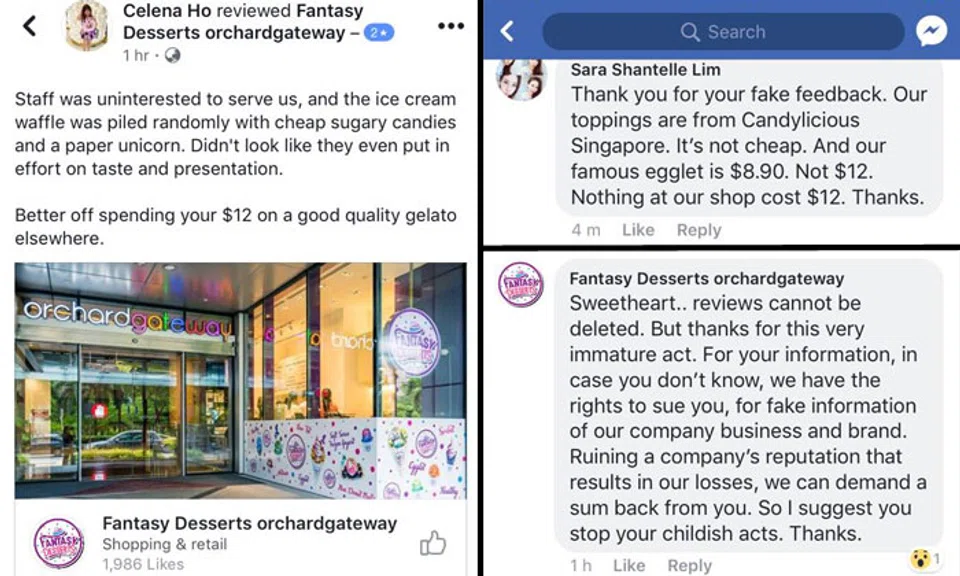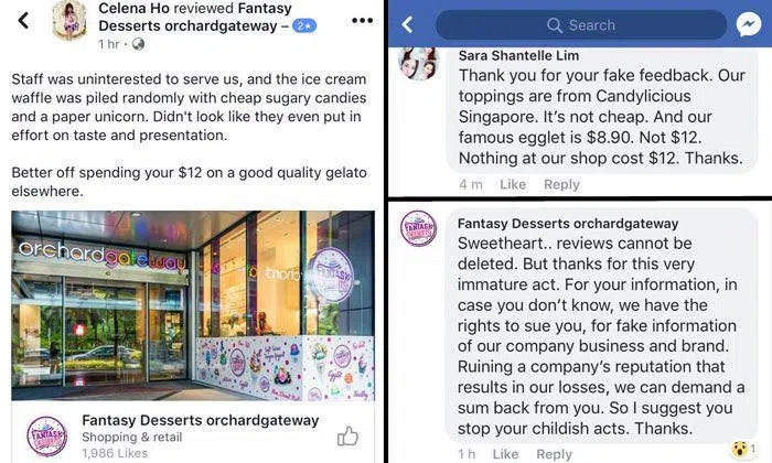 One dessert shop called Fantasy Desserts at Orchard Gateway demonstrated what you should not do when they threatened to sue a customer over a 2-star review.