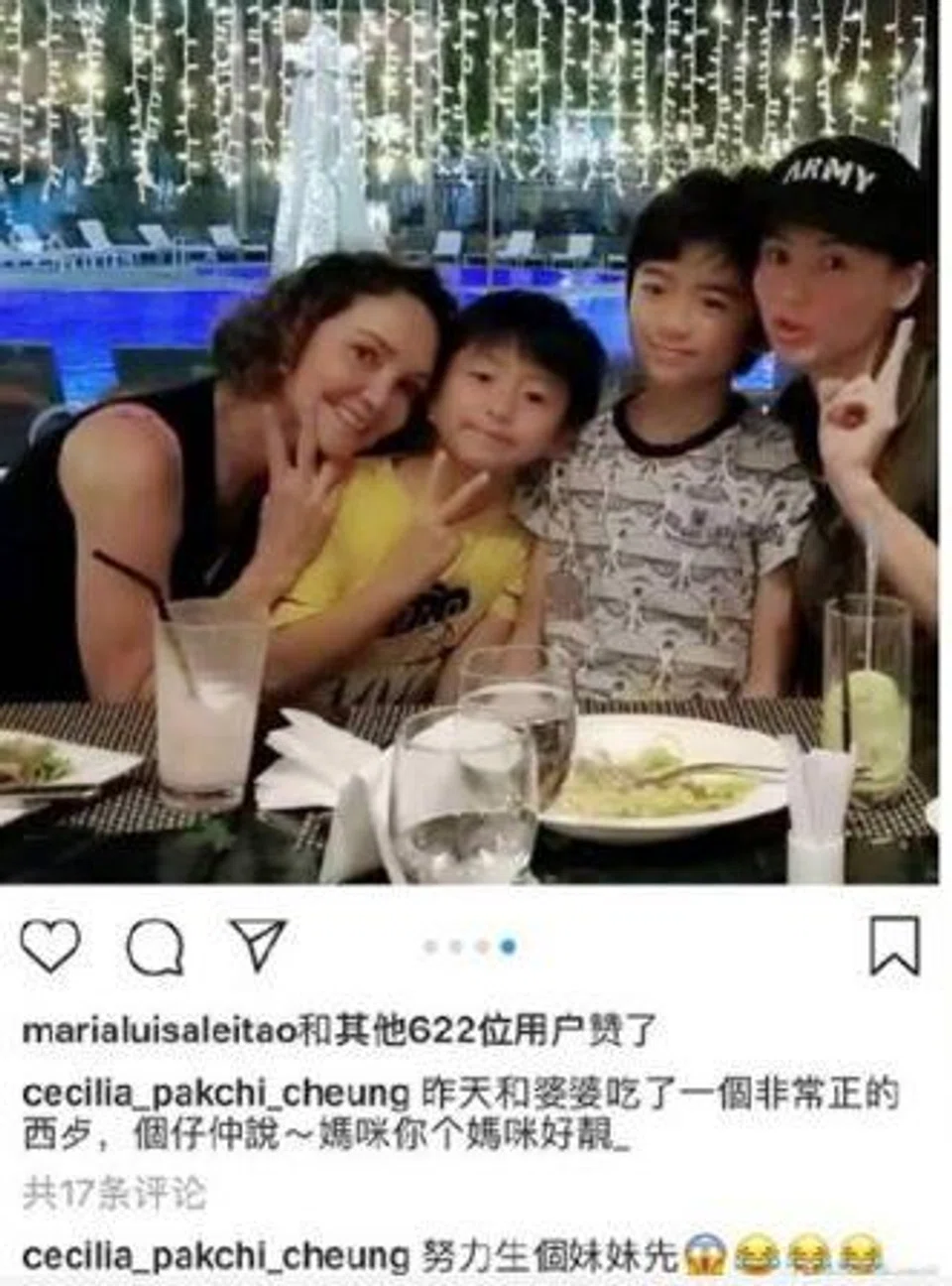 That same month, Apple Daily Taiwan also reported that Cheung was dating a Singaporean after she posted a photo of a man playing with her sons in the pool at Singapore's Marina Bay Sands.