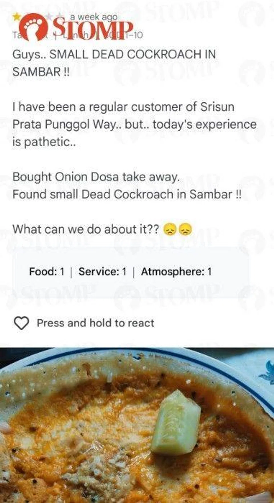 Srikanth said he found a cockroach in his takeaway onion dosa from the Srisun Prata stall at Block 261 Punggol Way on Aug 19, at around 2pm.