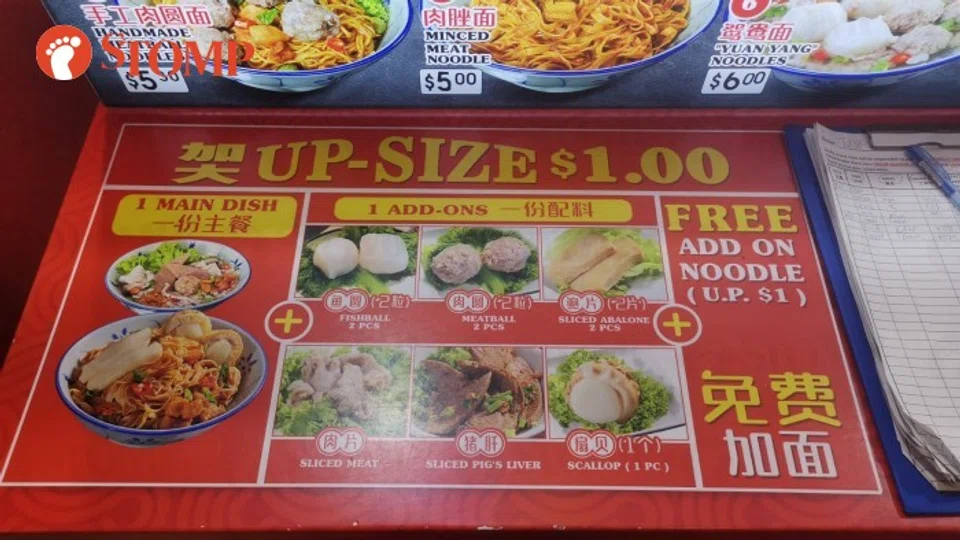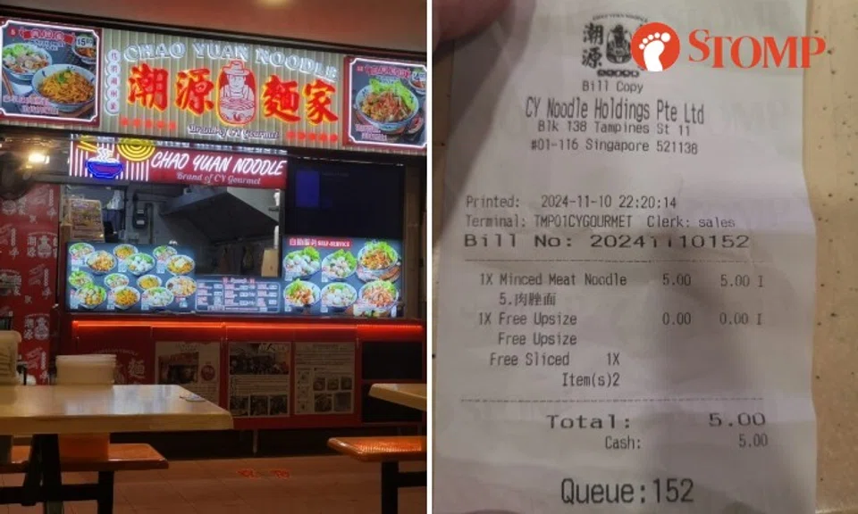 A photo of the receipt shows he paid $5 for the minced meat noodles, including the "free upsize", on Nov 10 at 10.20pm.