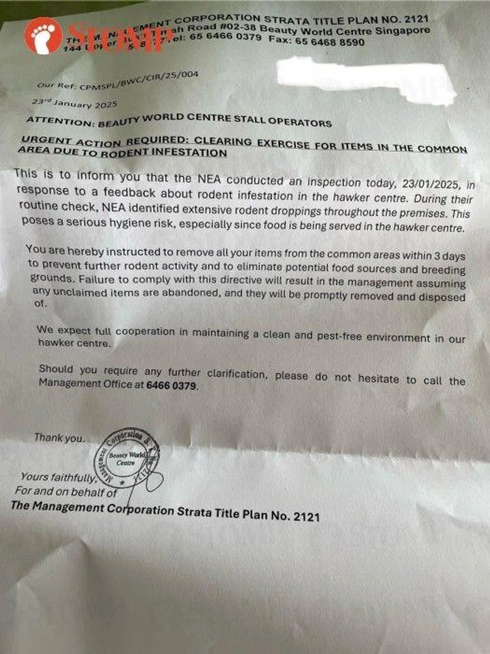 The Jan 23 letter requested stall operators to remove their items from common spaces to prevent further rodent activity, as well as "eliminate potential food sources and breeding grounds".
