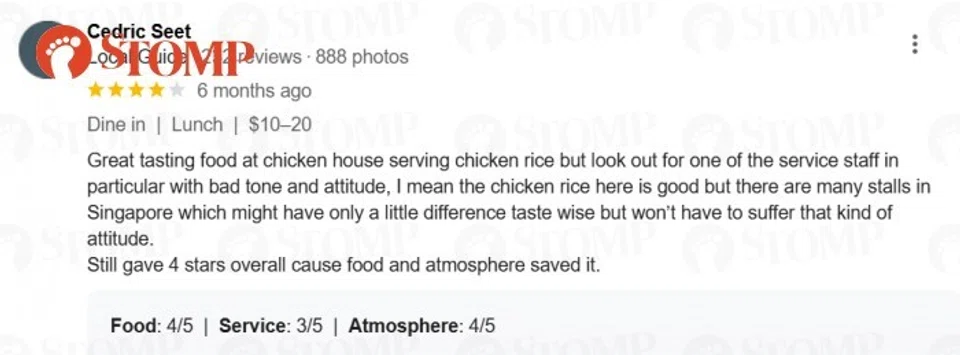 Many reviewers praised the food, but the bulk of negative reviews seems to stem from the eatery's service standards rather than its chicken rice.