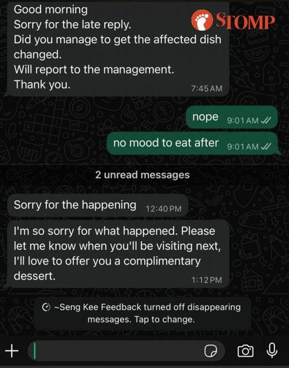 WP subsequently informed the eatery about the incident via WhatsApp, but was dissatisfied with the response he got.