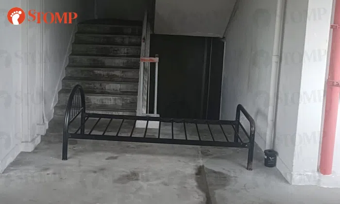 Discarded bedframe obstructs Bedok staircase, adds to cleaner's workload, inconveniences residents
