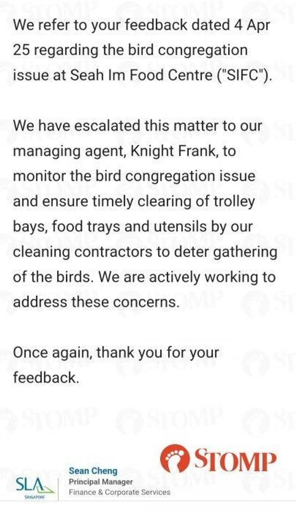 SLA told John that it had escalated the matter to the hawker centre's managing agent.