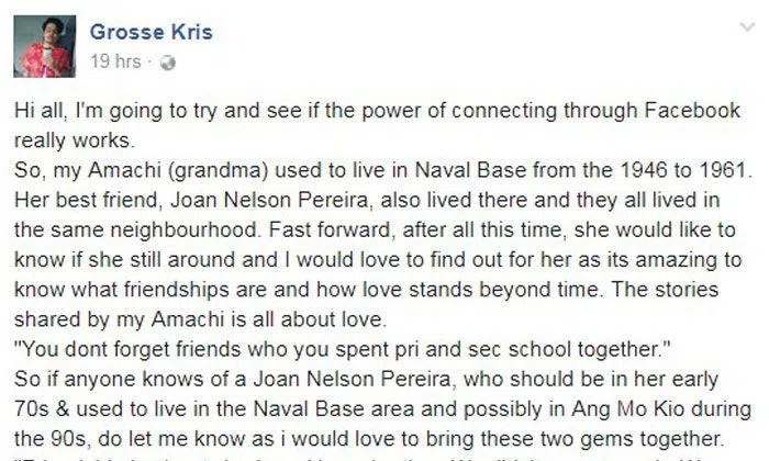 In his post that was published yesterday (Jun 28), Facebook user Grosse Kris explained that a Joan Nelson Pereira used to live with his grandmother in Naval Base from 1946 to 1961.