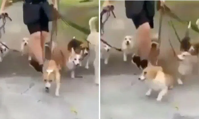 The authorities are investigating an incident where a dog trainer kicked a corgi while walking a pack of dogs.