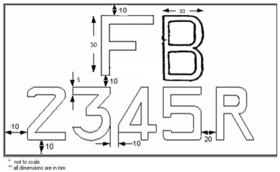 - Letters and digits are 50mm high, 30mm wide and 5mm broad.