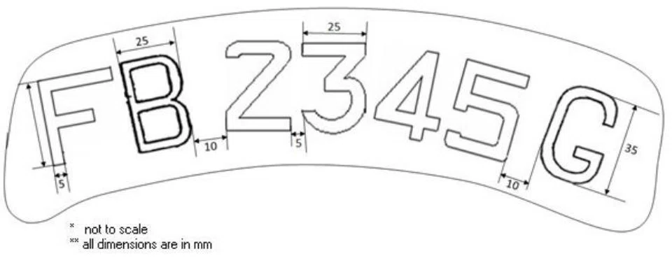- Letters and digits are 35mm high, 25mm wide and 5mm broad.