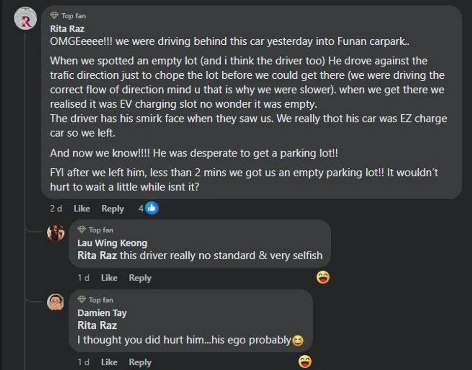 A Facebook user named Rita Raz commented on the photo on June 23: "We were driving behind this car yesterday into Funan carpark.