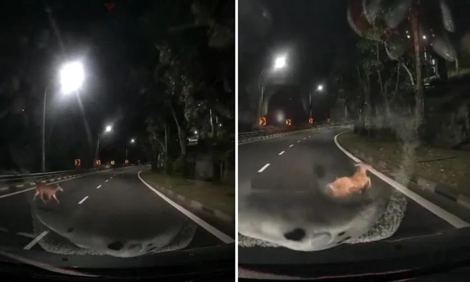 A vehicle managed to avoid hitting a deer crossing a slip road off Kranji Expressway (KJE), but another smaller deer behind the animal wasn't as lucky.