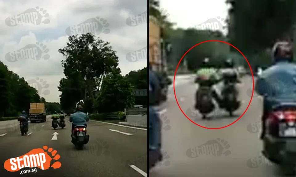 Two motorcyclists occupied the middle lane on the BKE towards Woodlands on Tuesday (May 9) at around 12.30pm, with one rider even placing his foot on the other's vehicle while the two chatted -- despite the oncoming traffic.