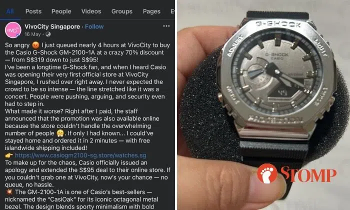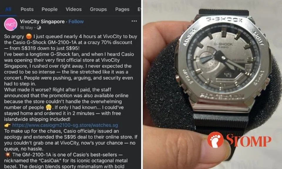 It read: "So angry I just queued nearly four hours at VivoCity to buy the Casio G-Shock GM-2100-1A at a crazy 70 per cent discount - from S$319 down to just S$95!