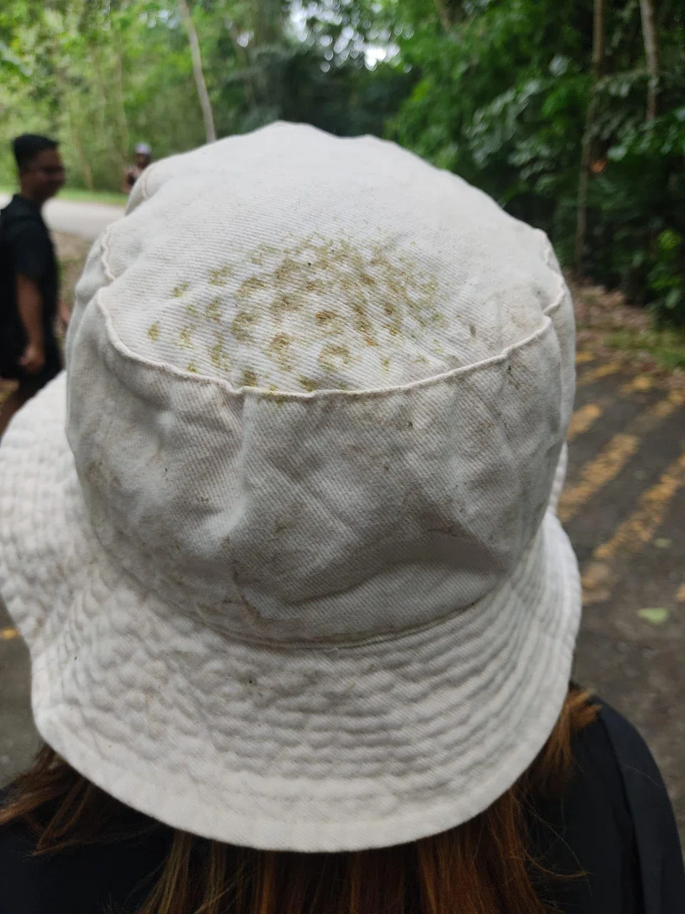 Photos show how the durian had left marks on the woman's hat. Staff from the National Parks Board (NParks) can be seen tending to her injury.