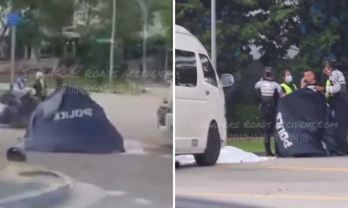 In a composite video posted on Singapore Roads Accident.com’s Facebook page at around 12.30pm, a few people can be seen holding up a large white sheet of cloth in front of a white minivan to shield the public from viewing the victim.