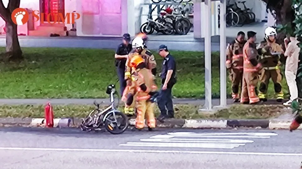 Stomper Rambutan shared videos and photos of the power-assisted bicycle (PAB) in flames and Singapore Civil Defence Force (SCDF) firefighters extinguishing the fire.