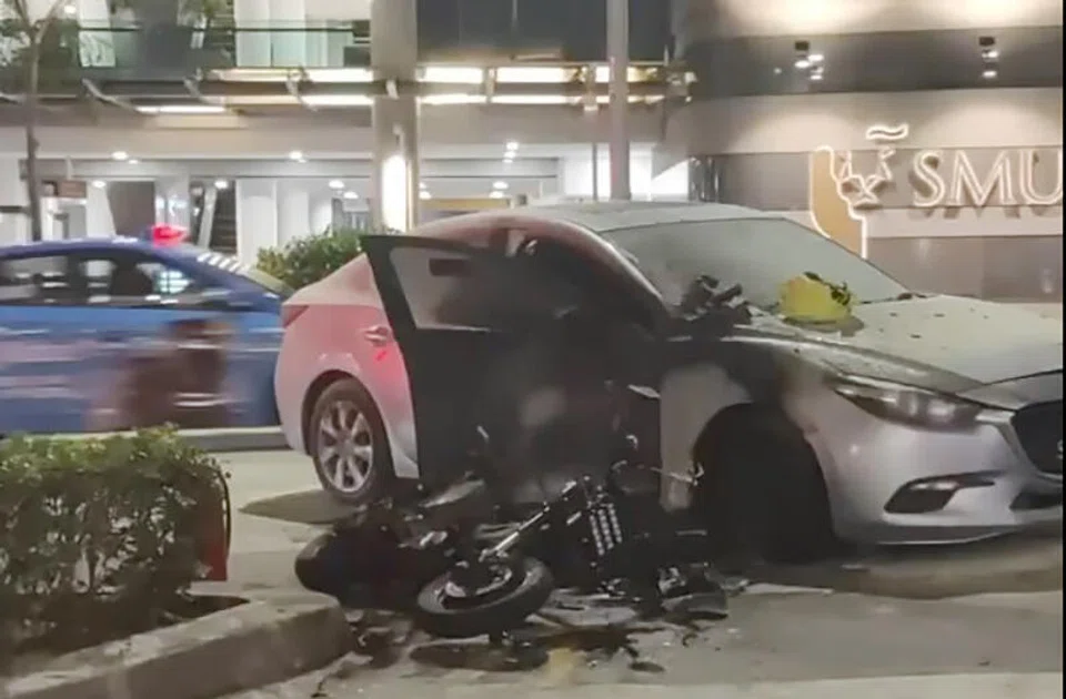 E-bike on fire after accident with car outside SMU, rider taken to hospital