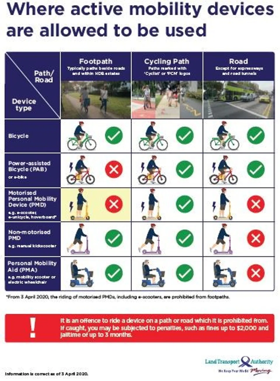 It is an offence to ride a device on a path or road where it is prohibited, and offenders can be fined up to $2,000 or face up to 3 months' jail.